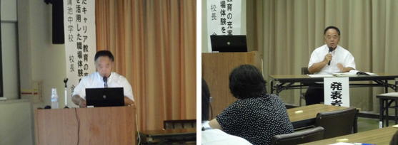 実践発表1では、人や社会とのかかわりを通して子どもを育成するため、職場体験に地域の教育力を取り入れた実践を発表いただきました。また、学校を支援していくための組織作りが地域から起こってきたその経緯も詳しくご説明いただきました。 |