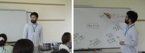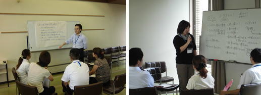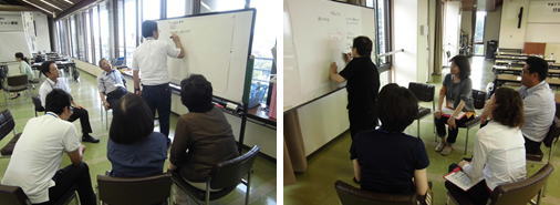 | ↑参加者の課題をグループで共有する場面 ↑グループで話したことを全体で共有 |
