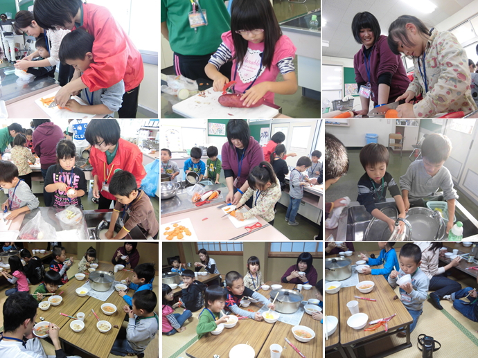 今回のメニューは豚汁と炊き込みご飯です。野菜を切ったり、お米を研いだり、みんなで仕事を分担し、協力して夕食の準備です。とっても美味しいご飯ができました。
