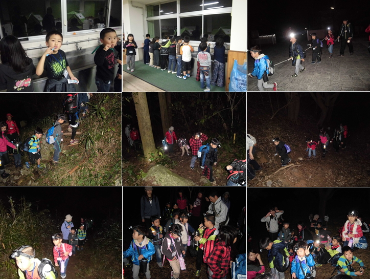 2日目は、3時30分に起きて、4時に山登り出発です。起きれるのか心配でしたが、起床の合図できちんと起きて、準備バッチリ!眠気スッキリ!準備万端!さぁ出発です。ヘッドライトを装着して庄内小学校から関の山の頂上を目指します。みんなで声を掛け合いながら、真っ暗な山道もどんどん進んで行きます。