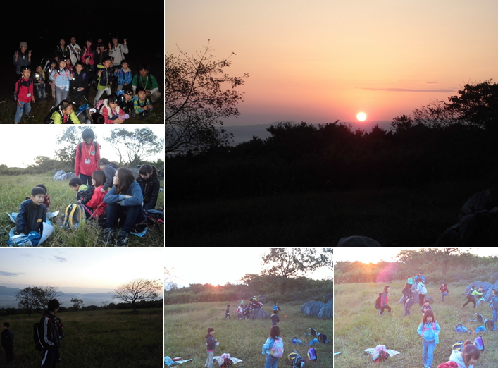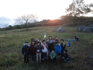 今回は、1日目に、「にこにこハウスづくり」でテントを張って、テントの周りは自由に飾り付け!建物の中ですが、テントに泊まりました。「にこにこ調理」では豚汁と炊き込みご飯を作って食べました。2日目は、にこにこキッズ!体験塾のメインプログラムである。早朝登山で関の山に登り、みんなで綺麗な朝日を見ました。 |