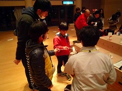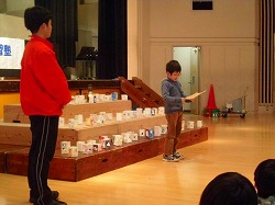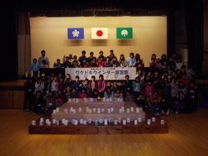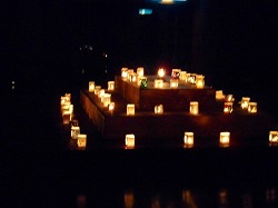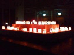 | 先ほど作った牛乳パックの灯篭に火を入れます。キャンドルに灯す火は先ほどランタンにとっておいた「友情の火」です。班長のキャンドルに分火された火を、こよりを使いながら一つずつ灯篭に入れたティーキャンドルに灯していきます。全員の灯篭がひな壇に並びます。そしてカウントダウン。「5・4・3・2・1・0!」電燈が落とされ、会場はキャンドルの灯だけになりました。「お〜!!!」歓声が沸きます。一つのだけのキャンドルなら小さな灯ですが、全員分集まると幻想的な光景になりました。「きれ〜い」「あったかい」「こころが温まる感じがする」という感想が聞かれました。 |