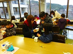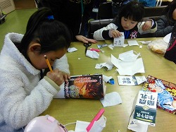 | 作って(だご)切った(野菜等)材料を大鍋に入れて煮込んでいる間に牛乳パックを使った灯篭つくりをしました。パック表面のフイルムをはがし、模様を描いてカッターで切り取ります。慣れない道具で戸惑いながらもなんとか形にすることができました。 |