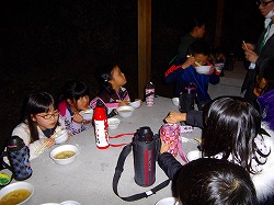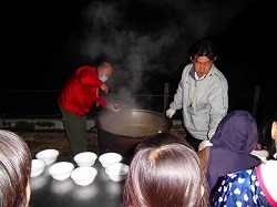 | 灯篭つくりが出来上がったころにだご汁も食べごろになって食事の時間になりました。大鍋からわきあがる湯気は迫力満点、みんな何杯もお代わりをしていました。(Aは時間の都合上、だごは別の鍋に煮てウインターキャンドル後に食べました。) |