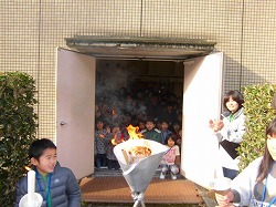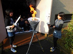 | 二日目の午前中はささぐりんピックで班対抗のスポーツ大会をしました。今年はオリンピックイヤー(Aはソチオリンピック直前、Bは真っ最中でした)ですので、開会式もオリンピック風の演出をしました。「友情の火」を聖火としてみんなで聖火リレー!キャンドルについた友情の火をみんなで回し、聖火台に灯しました。大きな火がついたときは「おお〜すげ〜」と歓声と拍手がわきあがりました。 |