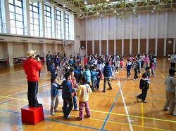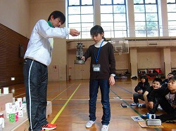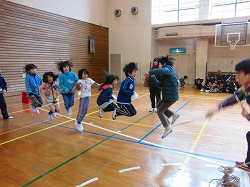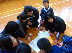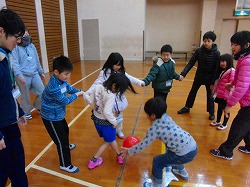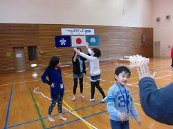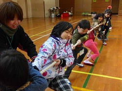 | 競技は長縄とび、風船運びリレー、馬跳び、綱引きを行いました。長縄はなかなか飛べずに暗いムードになりかけた班もありましたが、競技が進むにつれて団結力が生まれてきました。最後の綱引きでは自分たちで作戦を考え、勝てば歓喜の声で大はしゃぎするようにもなりました。そして総合優勝した班には社教センター特製の「木」メダル(桜チップで作ったメダル)が授与されました。 |