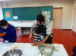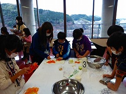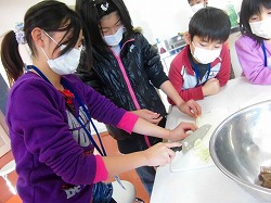 この日の夕食はだご汁です。まず、だご(だんご)を作ります。ビニール袋に入れられた小麦粉に塩水を入れてこねていきます。始めは混ざらなかった粉と塩水が段々と混ざって粘土のような触感に変わってきます。さらにこねて弾力をつけ一口大のだごにしていきます。次に野菜などの具材切りです。5・6年生は家庭科で包丁を使い慣れていますが、低学年の子達はほとんどが初めての体験。スタッフや上級生が手を添えるようにして少しずつ切っていきました。