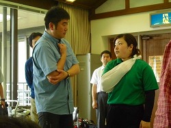 午後はファーストエイドの研修としてテーピングの実習です。三角巾の使い方や、登山中に捻挫をして、歩いて下りなければならない時の応急処置として、テーピングをセンタースタッフの足を実際に使って習いました。 |