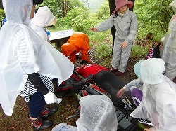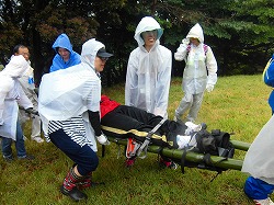 裏山の頂上で倒れている傷病者役(スタッフ)を担架に乗せ、急な坂を下りていきます。途中(井上先生の設定で)傷病者が不調をうったえますが、それぞれのグループで対処して無事に集合場所の広場まで運ぶことができました。