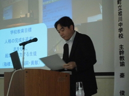 | 桂川中学校が地域連携を始めるきっかけとなった学校の課題と、そこに向けた校内の組織づくりや教育委員会、PTA組織、地域住民、その他各種学校等との連携について桂川中学校主幹教諭の秦先生より発表していただきました。 |