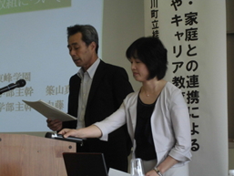 ≪実践発表≫ 学校を中心に地域や家庭との連携を進めている2つの地域について、その特徴的な取り組みと、その実際について報告いただきました。 |