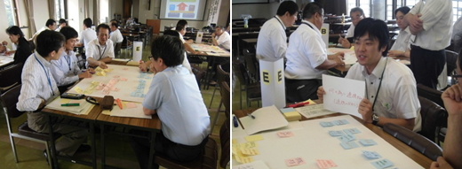 | 学校と行政の参加者を混合したグループ編成で、連携に向けた道筋づくりについて協議しました。まずはそれぞれが思い描く理想的な開かれた学校の姿から出発し、そこに向けた促進要因と阻害要因について考え、連携の足掛かりをどこから始めていくのか、グループで協議しました。それぞれお互いの声を聴く機会がないので、本音の協議を進めていく中で、お互いの思いを知ることができてよかったとの声が多く聞こえてきました。 |