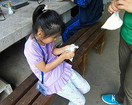 続いての活動は、「裏山へいこう 〜いきいきビンゴ〜」です。家族ごとにポストを探しながら、濡れた山道を一生懸命登りました。チェックポイントのりんどう小屋では、スポーツドリンクで水分補給をして、みんなで記念撮影。降りてきた後の感想も「きつかった。」「すべって大変だった。」と子どもも親たちもちょっと頑張った活動になりました。