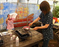 二日目は「親子で野外調理」です。まずは、パンの生地を作ります。コップやスプーンを使って材料を量り、ビニール袋の中で混ぜ合わせます。小さな子も粘土遊びの要領で、モミモミ、まぜまぜしました。しばらく、生地を発酵させる間に、バター作りとジャム作りです。バター作りは生クリームを瓶に入れ、ひたすら振るだけ。途中疲れてきたら、家族で交代して振り続けます。だんだん瓶の中でクリーム状にかたまってきます。お塩を混ぜて、出来上がり。ジャム作りは果物を鍋に入れ砂糖をかけて、つぶしていきます。火にかけながら少し煮詰め、最後にレモン汁を入れて完成。