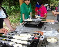 生地も膨らんできたので、いよいよパン焼きです。棒にアルミホイルを巻き、膨らんだパン生地を蛇のように伸ばしながら、棒に巻きつけていきます。あとは、炭火の上にかざして焼いていきます。裏、表にこんがり焼き目がついたら完成。バターやジャムをつけて食べました。