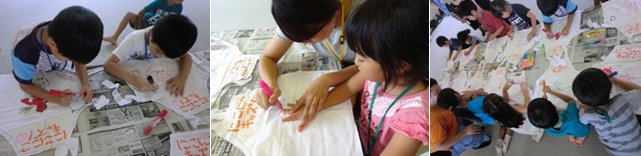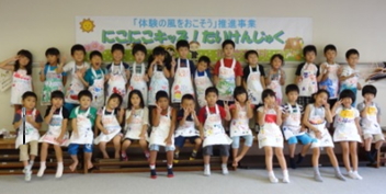 この後の、にこにこ調理と、3回目の野外調理に使うエプロンを作りました。真ん中には、自分の手をなぞって名前も描きました。みんな好きな絵を描いたり、世界にひとつだけの素敵なエプロンができました! |