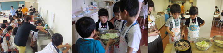 先ほど作ったエプロンを着て、野菜炒めを作ります。初めて調理をするお友達も多く、ボランティアのお兄さん、お姉さんに教えてもらいながら、協力して作ることができました。自分達で作った野菜炒めは最高においしかったですね! |
