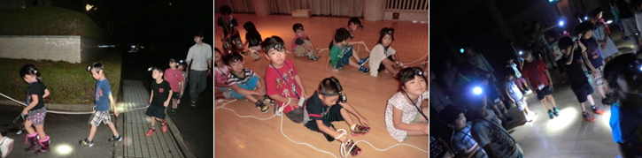 ヘッドライトを装着して、館外を探検しました。みんなでロープを持ち、声を掛けあいながら進んでいきます。あじさい小屋の前では、虫や鳥の鳴き声や、木々の揺れる音を聴き、自然を感じることができました。 |