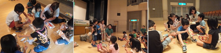 いよいよ自分で作ったおもちゃで遊ぶ時間です!紙トンボと竹水鉄砲では、遠くに飛ばせるようみんな必死です。水中メガネでは、きれいなビーズや石を見ることができました。