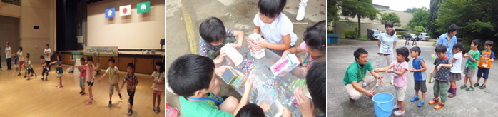 身近な材料を使って、紙トンボ・竹水鉄砲・水中メガネを作りました。難しい作業はお友達と協力しながら行い3種類のおもちゃを完成することができました。自慢の作品をみんなに発表してもらいました! |
