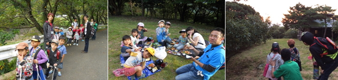 親水公園まで、ハイキングです。お天気にも恵まれ最高のハイキング日和でした。親水公園で、にこリンピックを楽しんだ後は、センターの裏山に向けて歩きます!急な山道もグループのお友達で声を掛けあいながら頂上まで登ることができました。頂上では、きれいな夕日を見ながらおいしいお弁当を食べました。 |