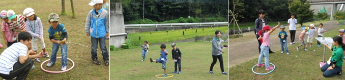 前回作ったおもちゃで、オリンピックならぬ、「にこリンピック」です!!竹水鉄砲では、得点の高い的をめがけて当てました!紙トンボでは、風も吹いており難しかったようですが、上手にかごに入れることができました!「明日天気になれ♪」では、靴飛ばしで一番遠くまで飛ばした人の勝ちです。お友達の応援も一生懸命しました。 |