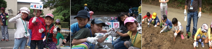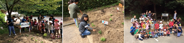 2日目は、センターのあじさい広場に花を植えました。土いじりの経験や、花を植えた事のないお友達もいて、みんな楽しそうでした。各グループで看板作りもしました。最後は、記念に大きな看板にみんなの名前を書いて完成しました!3回目の野外調理のときにはきれいに咲いた花を眺めながらカレーを作ります。 |