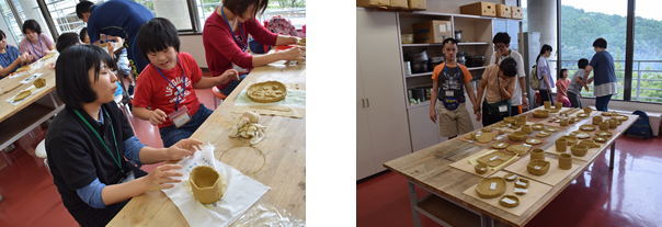 | 第2回目スタートの活動は陶芸体験です。当センターで活動されている水陶会の皆さんに教えていただきながら作品を作りました。粘土を捏ねたり、伸ばしたりしながら、お皿やコップ、キャラクターの形など、思い思いの作品を作り上げていました。集中して作品作りに取り組む姿が印象的でした。 |