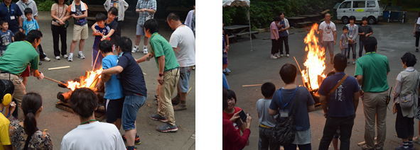 野外炊飯で、カレールーを煮込む時間を利用してキャンプファイヤーを行いました。トーチを手にし、火床に火を入れてくれるお子さんや周りで火が上がるのを興味津々で見つめているお子さんなど反応は様々でした。レクレーションも楽しくできました。短い時間でしたが記憶に残る時間となりました。 |