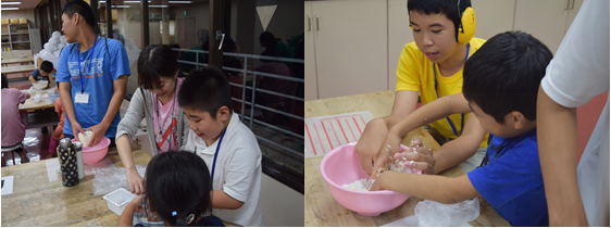 | 子どもの皆さんは月見団子を作りました。豆腐と白玉粉を合わせてよく捏ねます。捏ねたものを小さく切り取り丸めていきます。丸めたものをゆで上げたら出来上がりです。陶芸体験で捏ねる体験をおこなっていたこともあり、捏ね方も随分上手になっていました。 |