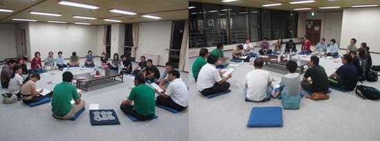 | 保護者の皆さんは別会場で座談会をおこないました。第2回ということで少し打ち解けた雰囲気でスタートしました。今回はキャンプに参加されてからのお子さんの変化やプログラムについての意見を自由に出していただきました。また、日頃の子育てについて悩まれていることについても意見交換を行うことができました。また、福岡県教育センターの堀修二先生にも助言をいただくなど今後の子育てにつながる座談会となりました。 |