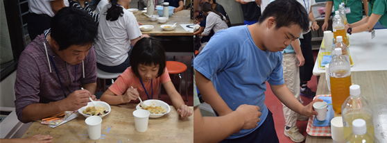 月見だんごづくり、保護者懇談会終了後には、出来上がったお団子を全員で食べました。きな粉やあんこ、アイスをトッピング。センター特製ドリンクバーでジュースを注ぎます。団子を頬張ると自然と笑顔がこぼれていました。ほっと一息つくことのできる時間となりました。 |