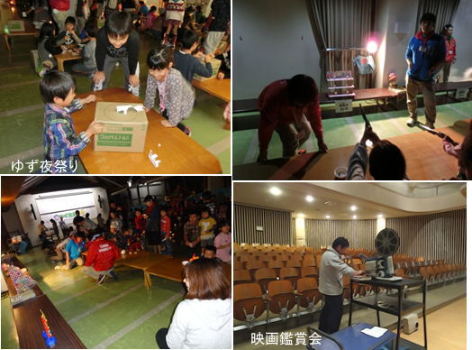 『ゆずホットタイム』を実施しました。特に、『ゆず夜祭り』は間接照明のみを使用し、お神輿や法被を飾るなどして、夜祭りの雰囲気を演出しました。また、射的や金魚すくい等、昔ながらの夜祭りを再現し、子どもも大人も大いに楽しんでいました。 |