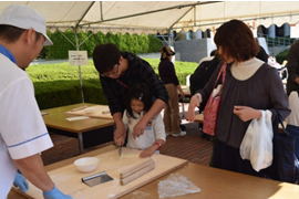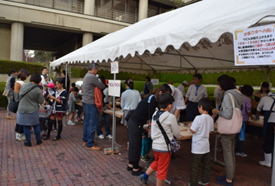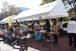 今年度新たに、『豚汁』『白玉ぜんざい作り体験』を設け、正面玄関前広場は大賑わいでした。毎年、出店している『手打ちうどん作り』『バザー』は、行列ができるほどの大人気でした。天候にも恵まれ、みなさん楽しく食事をしていました。 |