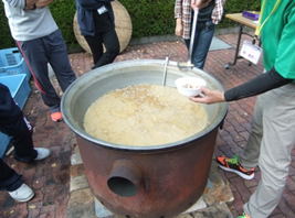 巨大な鍋で作る豚汁にみなさんびっくり!!味もばっちり☆ |