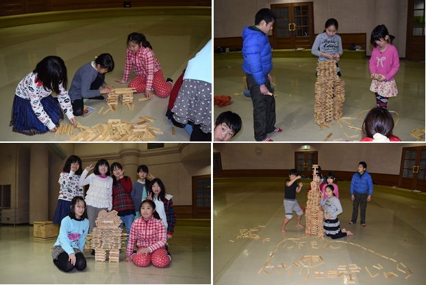 カプラ積み木とは、厚さ1センチ、長さ15センチ、幅3センチの細長い板のことで、欧米諸国では、たった1種類の板からイメージしたものを何でも作れる不思議な「魔法の板」として親しまれています。途中で崩れたりすることもありましたが、みんなで相談、協力をして納得のいく作品を作り上げることができました。