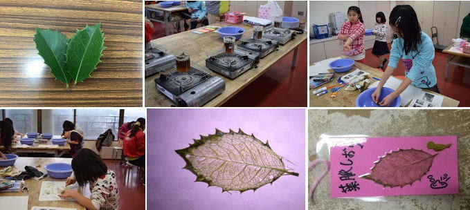 | 子ども達にも身近な、ヒイラギモクセイというトゲトゲした葉を使い、しおりを作りました。葉を重曹の5パーセント水溶液で2時間ほど煮込みます。煮込んだ葉は色も変わり、びっくりするほど柔らかくなりました。柔らかくなった葉を、歯ブラシで優しくトントン叩くと葉肉が取れて、葉脈が現れます。葉脈を好きな色の台紙といっしょにパウチして、完成です! |