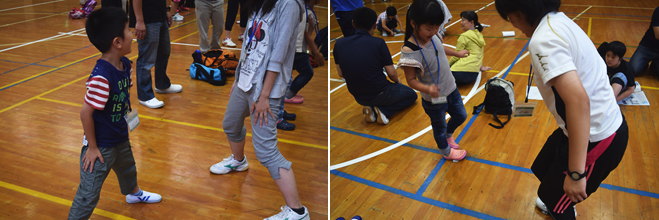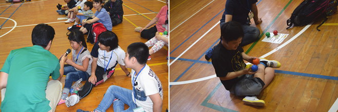 | 出会いのつどいでは、太鼓を叩いた数に合わせた人数のグループをつくり、レクレーションや自己紹介を行いました。グループの人数が増えていくにつれて、様々な人との交流ができました。「はじめはだれだ?」ゲームでの皆さんの素敵な笑顔がとても印象的でした。 |
