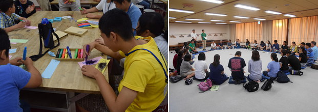 | 夜は大人と子どもが分かれて活動を行いました。子どもの皆さんは七夕飾りを作りました。短冊に願いごとや絵をかいたり、きれいな飾りをたくさん作ったりすることができました。保護者の皆さんは座談会を行いました。今回のキャンプに参加しての感想や日頃の悩みについて意見交流を行いました。また、福岡県教育センターの福田洋隆先生にもアドバイスをいただくなど有意義な時間を過ごすことができました。 |