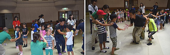 | サンサンレクリーションでは、「すてきな友だち」を参加者全員で、歌って踊りました。最初は、恥ずかしそうにしたり、一人で不安になったりする子がいましたが、少しずつ緊張もとけて笑顔が出るようになりました。その後、フラフープリレーやじゃんけん列車などのゲームで盛り上がりました。 |