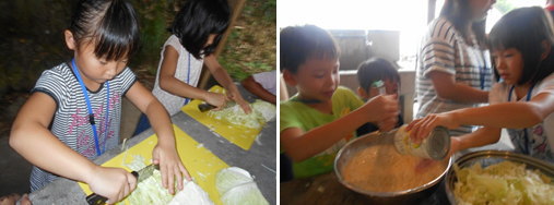 | サンサンわんぱくクッキングでは、野外でのお好み焼きづくりときのご飯づくりをしました。前回よりもボランティアスタッフの数も増え、安全面にも配慮をして活動ができました。自分から進んで作業をする子どもたちがたくさんいました。1回目よりも上達しているなという実感がありました。 |