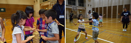| グループで協力したり、ペアになって協力したりするゲームを5種目行いました。勝ち負けにこだわって自分勝手をするような態度はほとんど見られずに、チームで協力して一生懸命取り組む姿がとてもよかったです。 |