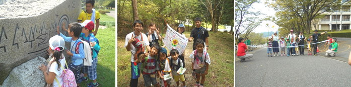 | 樹芸の森まで、写真を地図がわりにしながらチームで協力して往復するハイキングを行いました。5か所のチェックポイントを設置して、「虫や木の実をさがす」「出会った人にあいさつをする」などの課題をクリアしながら歩きました。年長児や1年生にとっては、初めての長距離の歩行で、体力的にもかなりきつかったと思われますが、最後はたくさんのお迎えの保護者が見守る中、全員笑顔でゴールすることができました。 |