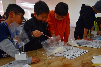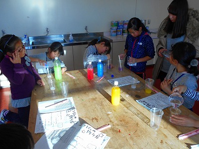 | 色水とほう砂、PVA合成洗濯のりを素早くかきまぜて、好きな色のスライムを手作りしました。それぞれ必要な分を量り取るのが難しい子もいたようですが、同じ班の仲間の助けもあり、無事にスライムを完成させることができました。 |