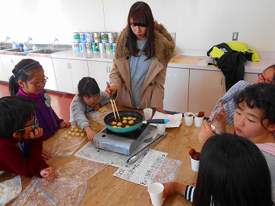 | サータアンダギー作りでは、とうふとホットケーキミックスを混ぜ合わせた生地を油で揚げました。各班で一生懸命活動に取り組み、おいしいサータアンダギーを作ることができました。自分で作ったサータアンダギーを満足そうに頬張る子どもたちの笑顔をみることができました。 |