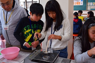 アメ作りでは、お玉に砂糖と水を混ぜ、ガスコンロで熱しました。各班で一生懸命に取り組み、工夫しながら、おいしいアメを作ることができました。自分で作ったアメを美味しそうに頬張る子どもたちの笑顔をみることができました。
