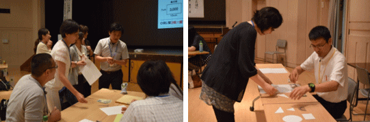 ゲーム終了後、売上の確認をして、ふり返りをしました。加留部先生から「ゲームを通じて感じたことで、あなたの現場でも起こりうることは何でしょうか」という問いが与えられました。目的、時間、生産物の出来栄え等の視点から、参加者の皆様からは様々な気付きが生まれました。また、ワールドカフェ方式で、他国に行って他国での気付きが生まれる方も多数いらっしゃいました。 |
