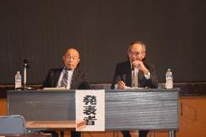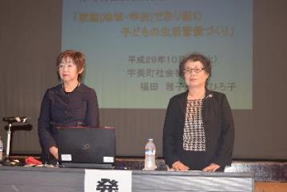宇美町全体で推進している「あいさつ運動」や「街頭啓発活動」について、社会教育委員として、どのようにかかわっていったのかについて具体的にお話ししていただきました。子どもの生活習慣に関するアンケート調査をもとに、課題を「あいさつについて」「地域とのかかわりについて」「携帯電話について」の3つに焦点化しながら、解決に向けた取組についてお話していただきました。さらに、学校や家庭と連携した「コミュニティースクール」の取組については、地域の方や保護者とつながるため、合同防災訓練や合唱コンクールなどの行事に積極的に参加している実践をお話され、参加者が熱心に聞き入る姿が見られました。