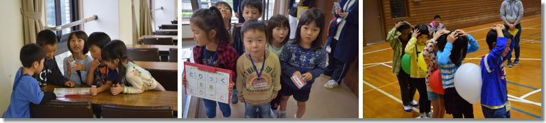 | 施設内のきずなの森のアトラクションを回る予定でしたが、雨が降ってしまったため、館内での活動となりました。「ジャンボシーソー」「宝探し」「大縄」「風船列車」「バランスウォーク」という5つのアトラクションに、班で協力しながらチャレンジしました。「宝探し」では館内のヒントを頼りに、「トリック