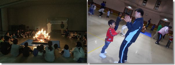 | 夜の活動では、キャンドルのつどいを行いました。第1部では、それぞれの班で代表の子どもたちが、火の神からろうそくに火を灯してもらったあと、誓いのことばを言いました。誓いのことばを言う子どもを募ったところ、たくさんの子どもたちが立候補してくれました。チャレンジしようという気持ちを持つ子どもが増えているように感じました。第2部では「すてきな友だち」をみんなでおどったり、フルーツバスケットをしたりして、楽しいひと時をすごしました。 |